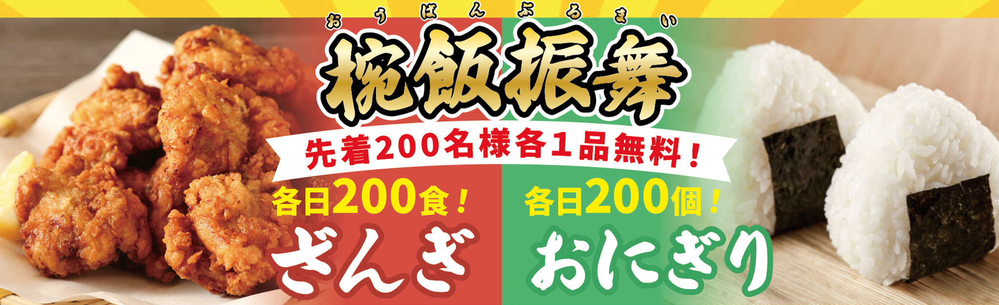 さらに、絶品グルメ椀飯振舞の屋台を出店いたします。北海道名物のざんぎ、おにぎりをお楽しみいただけます。先着200名様は各1品無料、それぞれ各日200食限定ですので、ご希望の方はお早めにお越しください!