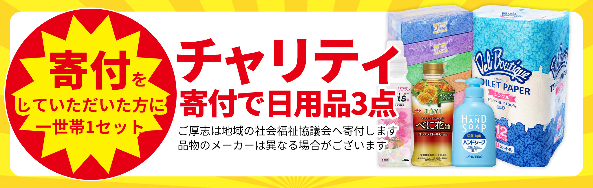 地域の福祉協議会へ寄付をしていただいた方に、日用品3点セットをプレゼントいたします!1世帯1セットまで、物価高の昨今にうれしい企画ですので、この機会にぜひご参加ください。皆さまの温かいご協力をお待ちしております!