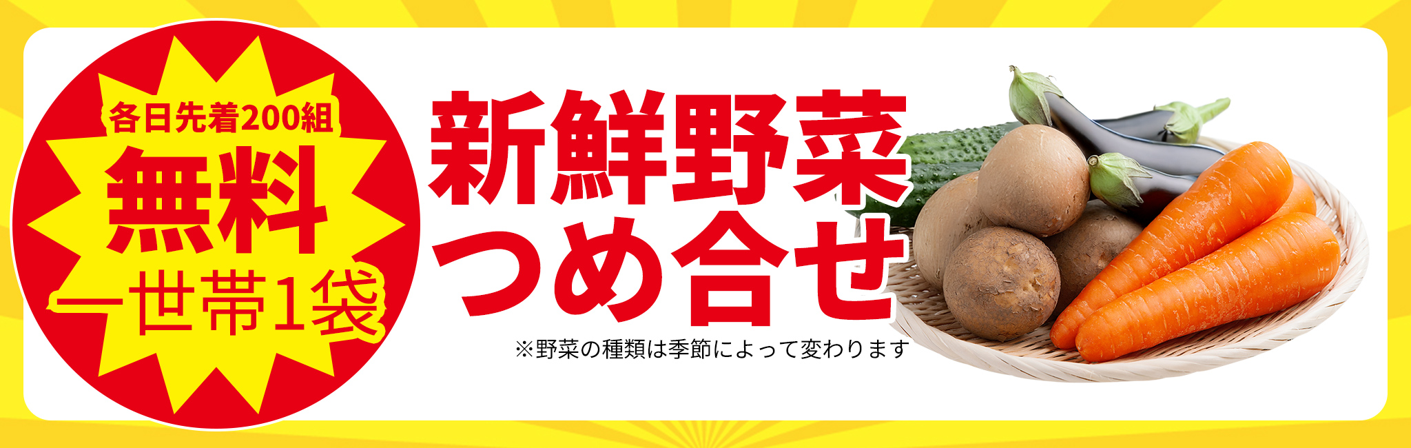 新鮮野菜つめ合わせたお得なセットを各日先着200組に無料でプレゼントいたします。1世帯1袋までなっておりますので、ぜひお早めにお越しください。この機会に季節のおいしい野菜をGETしましょう!