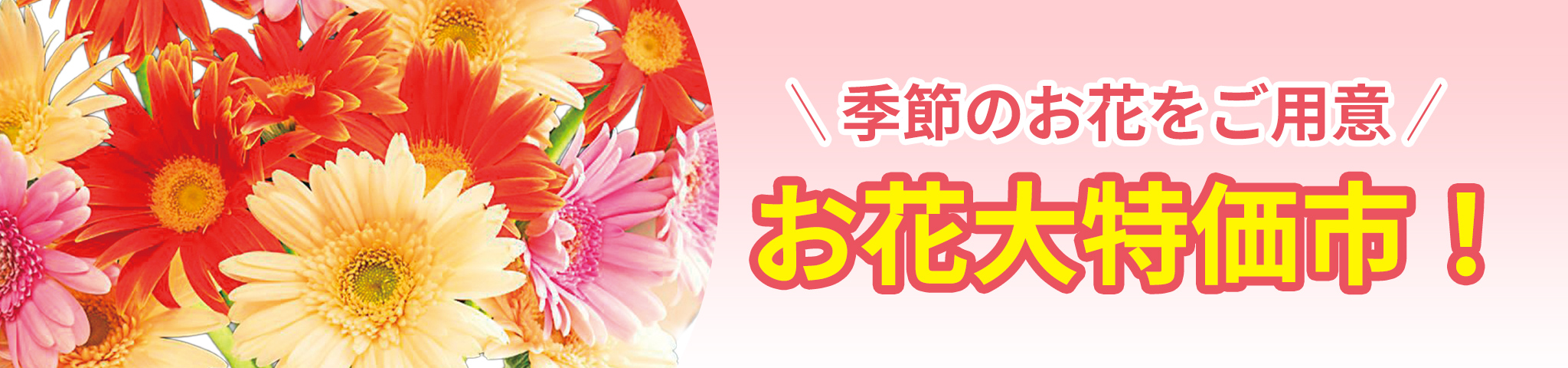 色とりどりの季節のお花を、特別価格でご購入いただける「お花大特価市」を実施します。ご自宅用はもちろん、贈り物にもぴったりな新鮮なお花を、通常よりもお得にお求めいただける人気企画です。数に限りがございますので、ぜひこの機会にお気に入りの一輪を見つけにお立ち寄りください。