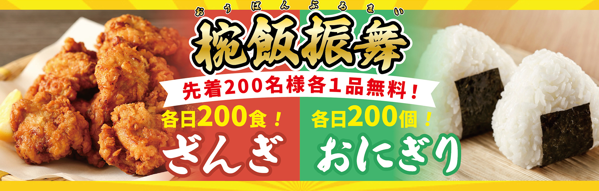 さらに、絶品グルメ椀飯振舞の屋台を出店いたします。北海道名物のざんぎ、おにぎりをお楽しみいただけます。先着200名様は各1品無料、それぞれ各日200食限定ですので、ご希望の方はお早めにお越しください!