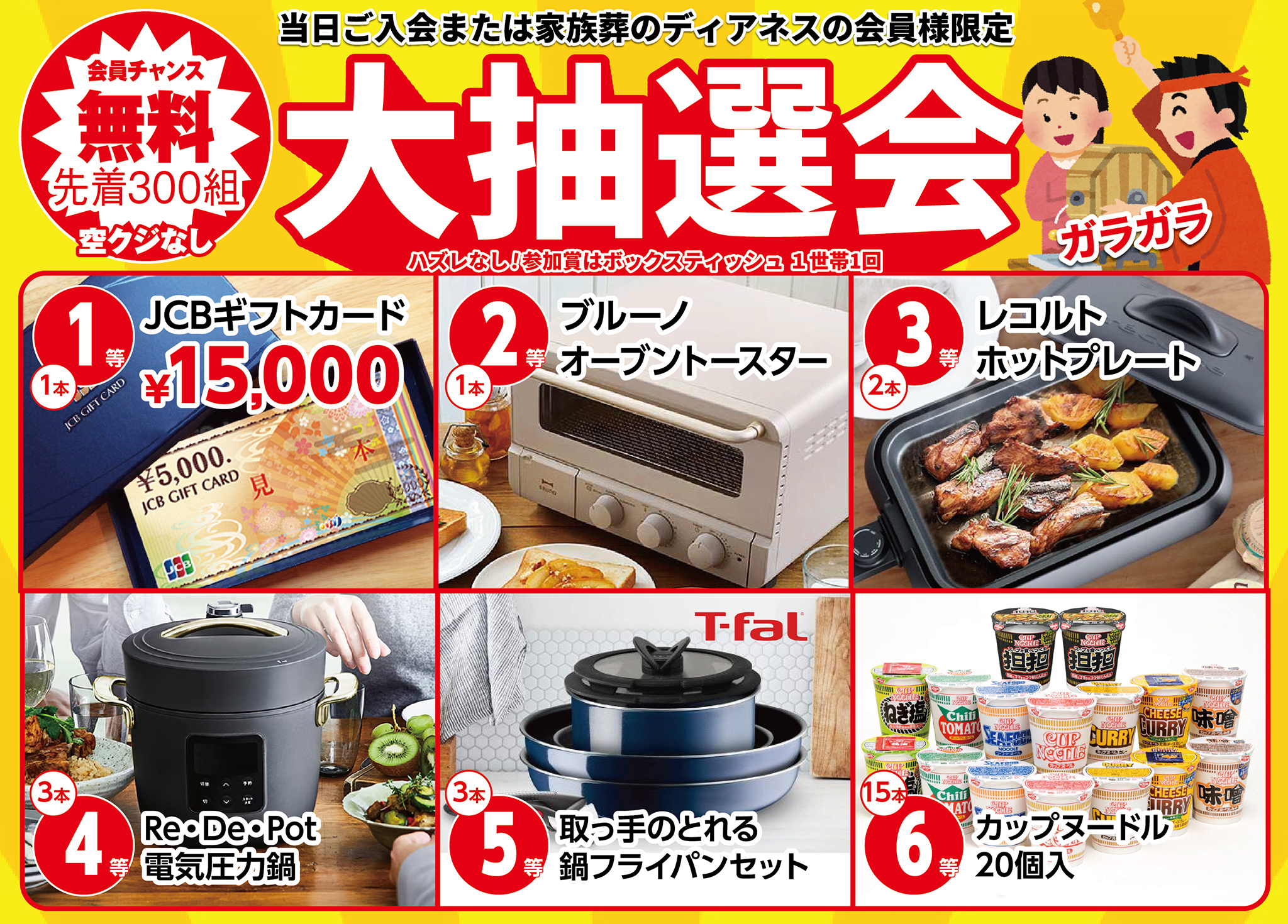 当日は豪華賞品が当たる大抽選会を開催いたします。1世帯1回まで、先着300組限定で、ディアネス会員様・または当日ご入会いただいた方は無料でご参加いただけます。ハズレなしのお得な抽選会ですので、この機会にぜひご参加ください!