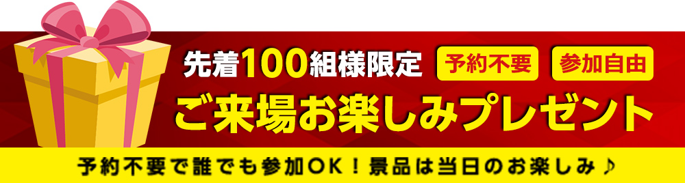 先着で100組の方には、来場者プレゼントもご用意しております。何がもらえるかは当日のお楽しみとなっておりますので、GETしたい方はお早めにお越しください。