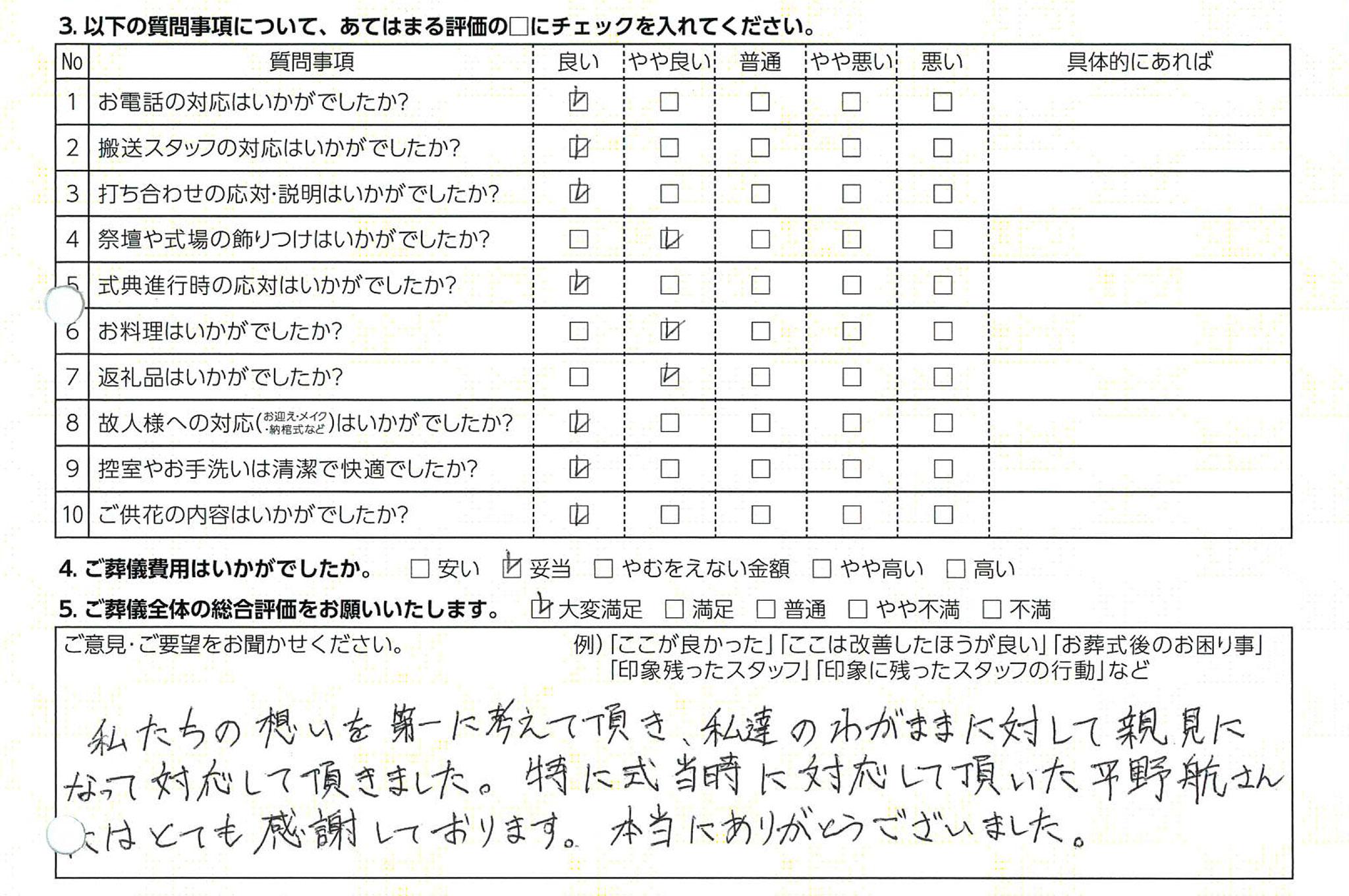 初めての事でわからない事が多くありましたが、家族でも気付かなかった物を用意して下さったり、親切な対応に感謝の気持ちでいっぱいです。会場も綺麗で気持ち良く終える事が出来ました。